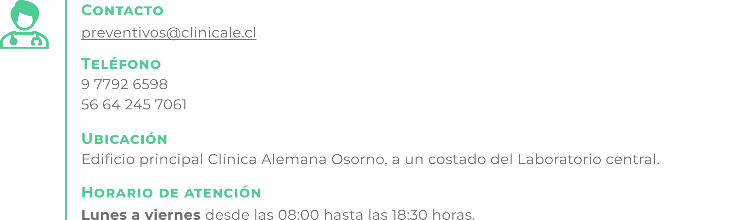 En Clínica Alemana Osorno estamos comprometidos con tu salud por lo que nuestra Unidad de Medicina Preventiva ofrece un Programa Preventivo Individual que brinda chequeos integrales según edad, género, factores de riesgo y estilos de vida. La inscripción al programa es gratuita (excepto exámenes y consultas) y el modelo de atención es personalizado. Coordinamos el circuito de atención de exámenes y consultas en menos tiempo y según la disponibilidad y necesidades de cada paciente.